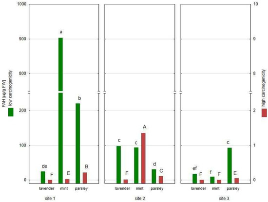 The sum of PAHs with high carcinogenicity was in the range of 0.001 (mint, Site 3) to 1.354 µg/g FW (mint, Site 2). The results presented in Figure 3 showed that all examined plant material contained at least one of the highly carcinogenic PAHs. Moreover, four of the tested plants (lavender from Site 2, parsley from Site 1 and mint from sites 1 and 2) contained three compounds with high oncogenic activity. In turn, mint from Site 1 was characterized by the highest sum of low carcinogenicity PAHs (902.3 µg/g FW), while mint from Site 3 showed the lowest sum of low carcinogenicity PAHs (9.1 µg/g FW). In addition, parsley from Site 1 contained a high level of low carcinogenicity PAHs (220.5 µg/g FW).