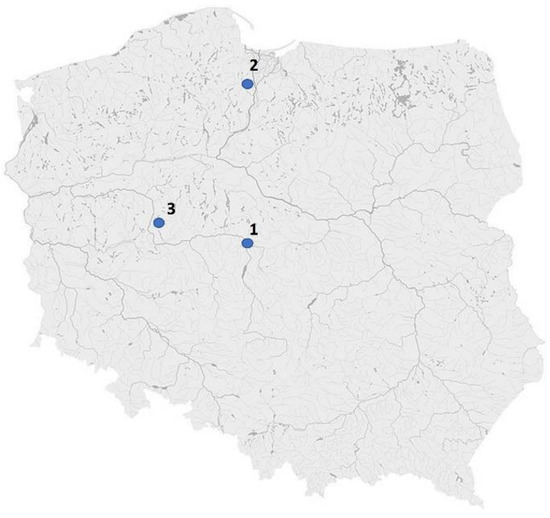 In the study, three popular Polish garden plants were used, namely, Lavandula angustifolia Mill. (variety Blue Scent), Mentha x piperita L. (variety Chocolate) and Petroselinum crispum Mill. Fuss. (variety Gigante D’Italia). All plant material was purchased from local stores (Sadowniczy, Kadzidło, Poland) and planted in three gardens in different regions of Poland at the same time. The herbs were cultivated in gardens located in three cities in Poland: Konin (1), Tczew (2) and Poznań (3) (Figure 4). Site 1 was a garden placed on the outskirts of Konin, within the Konin Brown Coal Basin and a lignite mine and energy plant complex. Moreover, plant samples were collected from home gardens in the center of Tczew (Site 2) and gardens located on the outskirts of Poznań (Site 3), in a place with little traffic and a motorway about 800 meters away. The plant material was collected from the gardens in the summer of 2022, in the second year after planting all the plants in the anthesis vegetation stage. Lavender buds, including young stems with flowers, as well as shoots and leaves of mint and parsley, were used for the analysis.