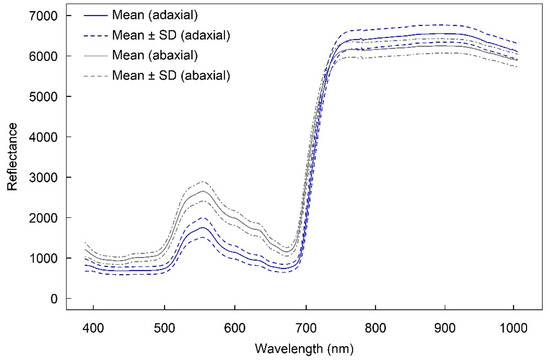 The mean (± SD) relative reflectance of the Vis–NIR spectra (400–1000 nm) from the adaxial (blue lines) and abaxial (grey lines) leaf surfaces (n = 120). The 100% reflectivity was scaled to 10,000 (integers) by default.