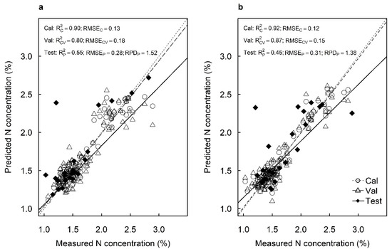 Measured vs. predicted nitrogen concentration (%) of the calibration set (Cal: open circles), cross-validation set (Val: open triangles) and test set (Test: closed diamonds) of macadamia cultivar ‘816’ leaves using hyperspectral images of the (a) adaxial and (b) abaxial surfaces and using all available wavelengths.