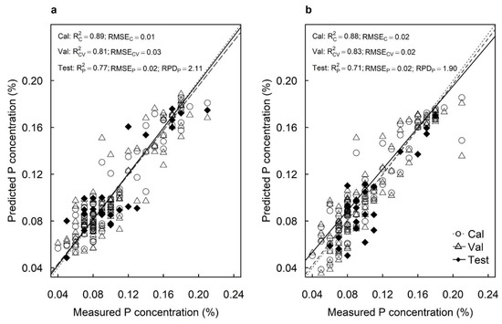 Measured vs. predicted phosphorus concentration (%) of the calibration set (Cal: open circles), cross-validation set (Val: open triangles) and test set (Test: closed diamonds) of macadamia cultivar ‘816’ leaves using hyperspectral images of (a) adaxial and (b) abaxial surfaces and using all available wavelengths.