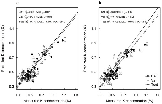 Measured vs. predicted potassium concentration (%) of the calibration set (Cal: open circles), cross-validation set (Val: open triangles) and test set (Test: closed diamonds) of macadamia cultivar ‘816’ leaves using hyperspectral images of (a) adaxial and (b) abaxial surfaces and using all available wavelengths.