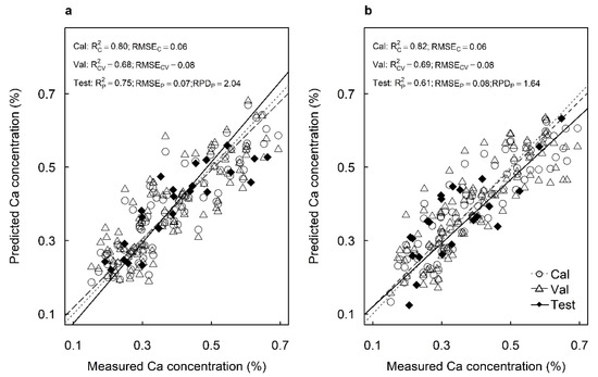The best-fit model using spectral data from the adaxial surfaces predicted Ca concentrations with R2C = 0.80, RMSEC = 0.06%, R2V = 0.68 and RMSEV = 0.08% in the cross-validation (Figure 5a). The best-fit model using spectral data from the abaxial surfaces predicted Ca concentrations with R2C = 0.82, RMSEC = 0.06%, R2V = 0.69 and RMSEV = 0.08% in the cross-validation (Figure 5b). The models predicted Ca concentrations with high accuracy for the test sets of the adaxial surface (R2P = 0.75, RMSEP = 0.07% and RPD = 2.04) (Figure 5a). However, the model predicted Ca concentrations with only moderate accuracy for the test set from the abaxial surfaces (R2P = 0.61, RMSEP = 0.08% and RPD = 1.64) (Figure 5b).