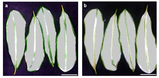 Regions of interest (shown in grey) that were used to extract mean spectral reflectance for (a) adaxial and (b) abaxial surfaces of macadamia cultivar ‘816’ leaves (scale bar = 22 mm).