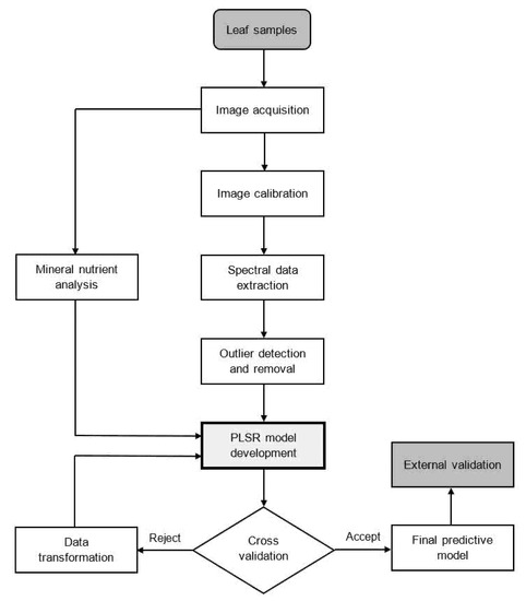 Hyperspectral imaging is an emerging technology that has been adapted for the rapid assessment of soil, leaves and agricultural products [21,22,23,24,25]. Hyperspectral imaging is a combination of spectroscopic and imaging techniques that enables the identification of chemical components and their spatial distribution in a sample [26,27]. The ability to capture spatial data allows the analysis of heterogeneous samples and so hyperspectral imaging requires minimal sample preparation [27]. Spectral and spatial data acquired by the hyperspectral imaging system can be correlated with chemical concentrations in the tested sample, allowing the development of models that predict chemical composition [26].