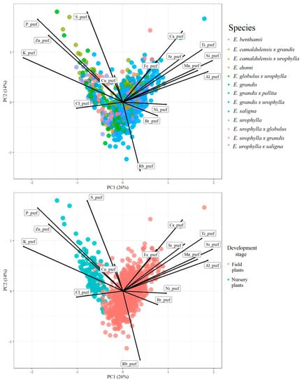 Principal component analysis (PCA) of portable X-ray fluorescence (pXRF) elemental data for Eucalyptus spp. leaves in different development stages.