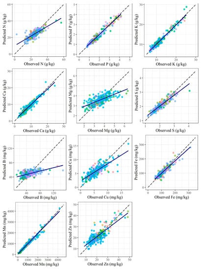 According to the authors’ knowledge, the results described hereafter have not been reported in the literature previously. Outstanding outcomes were found using foliar macro and micronutrients prediction models, which are shown in Figure 2 and Table 3. The observed and predicted scatter plots highlight the adequacy of fit for almost all nutrients (N, P, K, Ca, S, Cu, Fe, Mn, and Zn) (Figure 2).