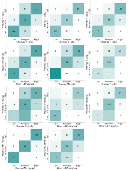 The highest overall accuracies found for leaf macronutrients followed the order S > P > Ca > K > N > Mg, and for leaf micronutrients, Mn > Fe > Cu > Zn > B. The categorical validation showed the practical performance of the prediction models while considering the nutrient status classes. Classification models constitute an elegant solution to compensate for datasets with many outliers, or when only a mixed dataset (composed of both categorical and numerical information) is available [16,18]. In this sense, even B and Mg that obtained poor R2 values (0.33 and 0.49, respectively) could be reasonably and well predicted, respectively, using categorical modeling (B, overall accuracy = 0.63, and Mg, overall accuracy = 0.70).