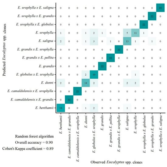 where Pc is the sum of the confusion matrix’s main diagonal (predicted nutritional status classes), N is the total number of validation samples, Po is the observed agreement, and Pe is the probability of random agreement [57]. The models with greater overall accuracy and Cohen’s Kappa coefficient were considered the best ones to predict Eucalyptus spp. clones and nutritional status.