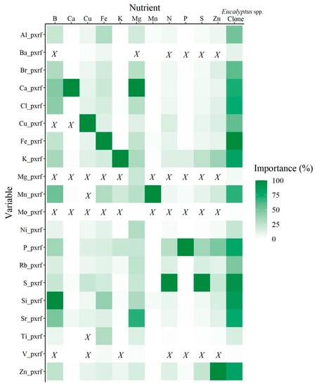 Explanatory variables used to predict the nutritional status of the Eucalyptus leaves and Eucalyptus spp. clones with their respective importance (%). X means that the variable was not used for the prediction model.