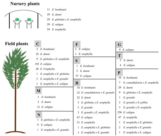 - Poke, F.S.; Vaillancourt, R.E.; Potts, B.M.; Reid, J.B. Genomic Research in Eucalyptus. Genetica 2005, 125, 79–101. [Google Scholar] [CrossRef] [PubMed]