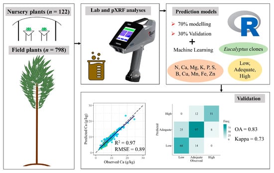 This study aimed to apply pXRF spectrometry data to: (1) characterize the elemental chemical composition of Eucalyptus leaves in different development stages; (2) evaluate the feasibility of predicting Eucalyptus spp. nutritional status regarding macro (N, Ca, K, P, Mg, and S) and micronutrients (B, Cu, Fe, Mn, Zn) both numerically and per class of nutrient status (low, adequate, and high); and (3) distinguish different Eucalyptus spp. clones. We hypothesize that pXRF spectrometry in tandem with machine learning algorithms constitute a suitable alternative method for clean, fast, and accurate prediction of Eucalyptus spp. nutritional status and clone differentiation.