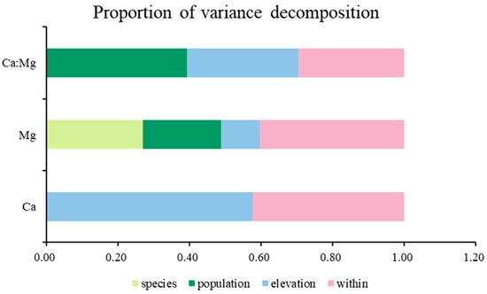 Different traits may have different sources of variation, mainly including genetic and environmental factors. Mg concentration was constrained more strongly genetically than environmentally, with 0.27 of the variance apportioned to species. Only 0.11 was due to elevation, which represented environmental effects partly. The variation of Ca concentration was greatly affected by elevation, with 0.58 of the total variance. The trait varied due to different environments and had a much higher level of plasticity. Intra-species variability was an apparent influencing factor in the variation of Ca and Mg concentration, as well as the Ca:Mg ratio. All traits had a certain proportion among individuals, consistent with previous studies [71]. There are also other reasons for variation. The functional type showed the greatest direct influence on most leaf minerals in the research of a larger research scale [72]. Therefore, the results of the source of variation for different circumstances are not in complete accord.