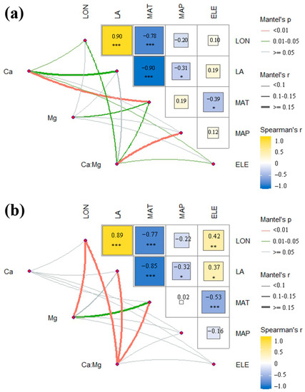 Calcium (Ca) and magnesium (Mg) are among the macronutrients of plants [1,2,3]. Based on principal component analysis (PCA) of elements, leaf chemical variation in nitrogen (N) and phosphorus (P) concentrations was recognized as the first axis of the “leaf economics spectrum” (LES) [4,5,6], whereas a gradient in Ca and Mg concentrations were labeled as the second axis of “structure and photosynthetic activity” [7], “mechanical properties” [8], or “digestibility” [9]. Thus, the variation pattern of plant Ca and Mg concentrations, although less understood than that of N and P, is crucial for understanding the ecological processes and functions of plants.