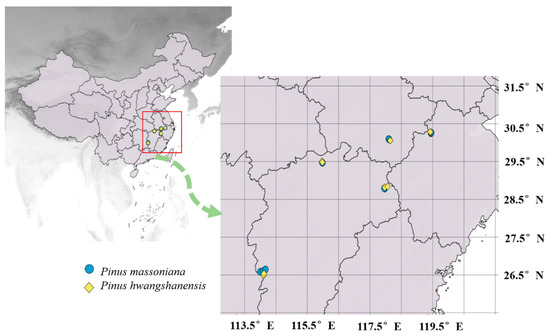 The samples were taken from five different sites in China, including Mt. Sanqingshan, Mt. Lushan, Mt. Jinggangshan, Mt. Huangshan, and Mt. Tianmushan. All these study sites need to meet the following conditions: (1) with both P. massoniana and P. hwangshanensis populations; (2) with an elevation gradient; (3) with both P. massoniana and P. hwangshanensis as a dominant species in local communities, respectively. These places are located in the middle subtropical zone, and the landforms are characterized by middle and low mountains, hills, valleys, and plains. It has an obvious monsoon climate, characterized by hot summer and warm winter, four distinct seasons, rain and heat over the same period, and developed monsoon. The annual precipitation is generally abundant, mostly 1000~2000 mm. The average annual temperature is usually about 16~20 °C, while the average temperature of the coldest month is generally between 5~10 °C. The typical soil is mainly red or yellow soil. The zonal vegetation is evergreen, broad-leaved forest with warm and temperate coniferous forests.