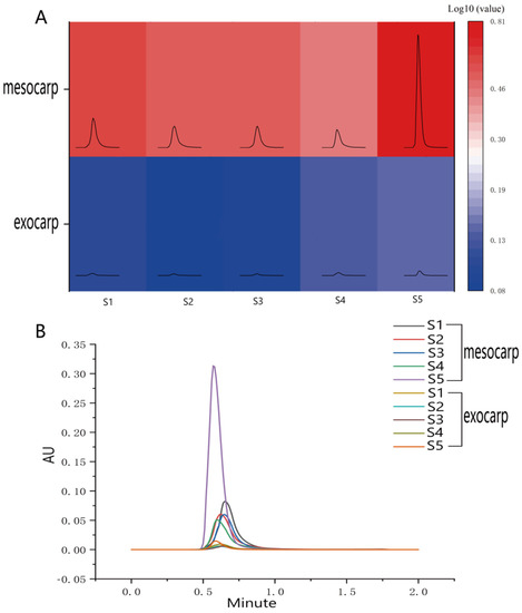 (A) UPLC heat map of trans-resveratrol content in exocarp and mesocarp of ‘Summer Black’ grape at different times of berry development, which were expressed as log10 fold change. The darker the heat map, the higher the resveratrol content. (B) Ultrahigh performance liquid chromatography retention times of mesocarp and exocarp at different stages of berry. Different line colors represent different stages.