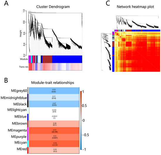 (A) Phylogenetic tree heat map associated with trans-resveratrol (trans-res) content. (B) Gene co-expression network heat map: on the left and top of the figure are the results of symmetric systematic clustering trees and gene modules. The domain represents the dissimilarity between genes, and the smaller the value, the darker the color. Genes between modules of the same color are darker, and genes between modules are lighter. (C) Heat map of correlation between co-expressed gene modules and resveratrol traits. Each row represents a module, and the vertical column represents the content of the resveratrol. The numbers in the rectangular box represent the correlation coefficient between the module and trait, and the corresponding p value. Red represents the positive correlation between the module and the trait, and blue represents the negative correlation.