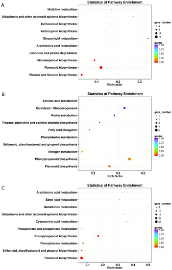 KEGG enrichment analysis was performed on magenta, cyan, and purple modules to determine the metabolic pathways related to resveratrol synthesis (Table S1). Among these pathways, flavonoid biosynthesis, phenylalanine metabolism, phenylpropanoid biosynthesis, and stilbene biosynthesis were the most significantly enriched (Figure 3). It was found that a total of 45 unigenes (Table S2) were significantly enriched in the flavonoid biosynthesis pathway, among which 25 unigenes encode CHS, and the remaining 20 unigenes encode F3’5’H (flavonoid 3′, 5′-hydroxylase), CYP73A (trans-cinnamate 4-monooxygenase), CHI (chalcone isomerase), F3H (naringenin 3-dioxygenase), PGT1 (phlorizin synthase), HCT (shikimate hydroxyl cinnamoyl transferase). A total of 25 unigenes were significantly enriched in the phenylpropanoid biosynthesis pathway, among which 12 unigenes encode PAL, and the remaining 13 unigenes encode 4CL, COMT (caffeic acid 3-O-methyltransferase), peroxidase, F5H (ferulate-5-hydroxylase), beta-glucosidase, CCR (cinnamoyl-CoA reductase), HCT. It is interesting that a total of 12 unigenes were significantly enriched in the phenylalanine metabolism pathway, and all of them were encoded as PAL. In total, 11 unigenes were significantly enriched in the stilbene biosynthesis pathway. Eight of them encode STS, and three unigenes encode HCT, C4H.