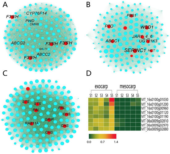 Interaction analysis of hub gene networks in significantly enriched resveratrol modules. (A) magenta module, (B) cyan module, (C) purple module. The hub genes and non-hub genes are represented in red and blue circles, respectively. The size of the point represents the weighted degree, and the larger the weighted degree, the larger the point. (D) exocarp and mesocarp quantitative heat map. The expression pattern of 8 selected genes identified by RNA-seq was verified by RT-qPCR.