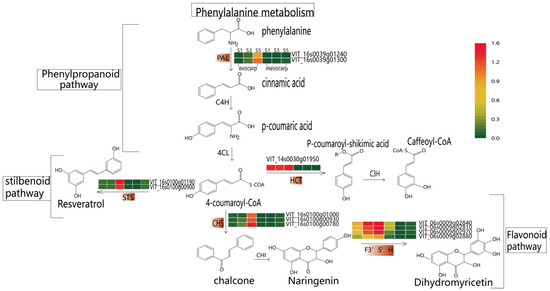 Using CytoHubba to visualize the interaction network MCC algorithm, the top 10 genes most related to resveratrol content in the three modules were selected (Figure 4A–C). Through homology comparison and gene annotation interaction, 12 hub genes related to resveratrol biosynthesis were obtained (Table S3). Based on the pathway map analysis of hub genes (Figure 5), among which 2 genes (VIT_16s0039g01300, VIT_16s0039g01240) encode to regulate the PAL enzyme, which plays a role in the first stage of resveratrol biosynthesis. 2 genes (VIT_16s0100g00900, VIT_16s0100g01190) encode to regulate the STS enzyme, which plays a role in the final step of resveratrol biosynthesis. In the flavonoid pathway, 3 genes (VIT_16s0100g00930, VIT_16s0100g00780, VIT_16s0100g01000) were annotated to the CHS enzyme. 4 genes (VIT_06s0009g02880, VIT_06s0009g02970, VIT_06s0009g02810, VIT_06s0009g02840) were annotated to the F3′5′H enzyme. 1 gene (VIT_14s0030g01950) was annotated to the HCT enzyme. The first step in the phenylpropanoid pathway is the deamination of phenylpropanoid acid to cinnamic acid by PAL. PAL had no significant change between mesocarp and exocarp from S1 to S3 stage, but increased significantly from S3 to S5 stage. STS catalyzes the biosynthesis of the stilbene backbone from three malonyl-CoA and a CoA-ester of a cinnamic acid derivatives in a single reaction. The contents of STS and PAL were the same, and S5 reached its maximum value at the exocarp and mesocarp, while the contents of S5 at the early stage were little or none. CHS is an important enzyme in flavonoid metabolism and a key point in regulating the biosynthesis of different flavonoid compounds. CHS reached its maximum value at the S5 stage in the exocarp with little accumulation and no significant change. CHS in mesocarp was almost nonexistent from S1 to S3 stage, but increased significantly in S5 stage. F3 ‘5’ H is synthesized by the flavonoid pathway, biosynthetic by catalyzing the hydroxylation of flavonoids at the 3 ‘, and 5’ positions. F3 ‘5’ H increased gradually in the exocarp, reached the maximum value in the S5 stage, and showed a decreasing trend in the mesocarp. In the phenylpropane pathway, HCT catalyzes the formation of p-coumadyl CoA into p-coumadyl shikimic acid, followed by the formation of caffeic shikimic acid. Further functionalization was catalyzed by HCT to produce caffeoyl CoA. HCT in exocarp and mesocarp had little change in previous periods, while S5 content increased.