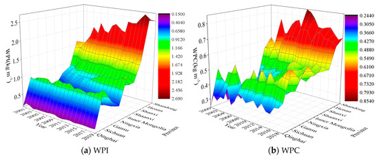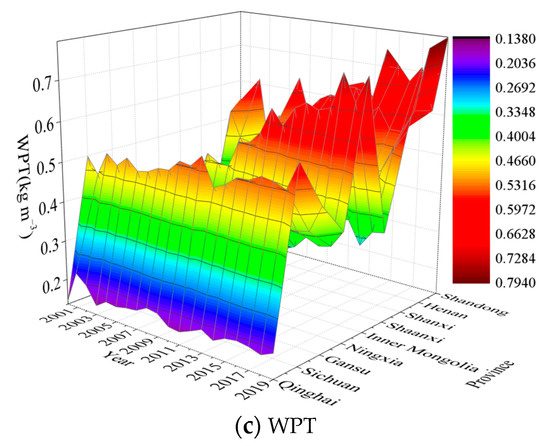 The statistical characteristics of water productivity in the Yellow River Basin are shown in Table 2. The mean values of WPI ranged from 0.22 to 2.11 kg/m3 in the Yellow River Basin and showed: Henan > Shandong > Shanxi > Sichuan > Inner Mongolia > Shaanxi > Gansu > Ningxia > Qinghai. The WPI showed weak variability in Sichuan and Shaanxi, where the variable coefficients were less than 10%, indicating that the variation amplitude of WPI was relatively small from 2000 to 2019. The WPI showed moderate variability in other provinces. The mean values of WPC ranged from 0.35 to 0.71 kg/m3 and showed: Shandong > Henan > Sichuan > Shanxi = Shaanxi > Ningxia > Inner Mongolia > Gansu > Qinghai. All provinces showed moderate variability for WPC. The mean values of WPT ranged from 0.18 to 0.61 kg/m3, and showed: Shandong > Henan > Inner Mongolia > Sichuan > Shanxi > Gansu > Shaanxi > Ningxia > Qinghai. The WPT showed weak variability in Qinghai, Sichuan, and Shaanxi, with variable coefficients of 9.15%, 5.83%, and 7.26%, respectively, indicating that the variation amplitude of WPT from 2000 to 2019 was relatively small, whereas it was moderate in other provinces.