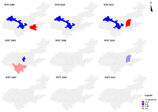 LISA cluster diagram of water productivity in the Yellow River Basin in 2005, 2010, and 2015.