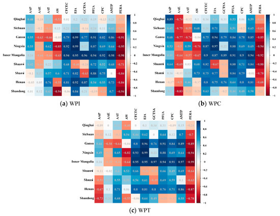 In Figure 4c, the correlation between WPT and the influencing factors was relatively small in the western (such as Qinghai and Sichuan) and eastern (such as Shanxi and Shandong) Yellow River Basin. In the northern Yellow River Basin, the WPT showed a significant positive correlation with CFCEC, EIA, GCTSA, PFUA, CPC, and AMTP in Inner Mongolia, with correlation coefficients of 0.95, 0.95, 0.97, 0.94, 0.91, and 0.97, respectively; the WPT showed a significant negative correlation with PERA in Inner Mongolia, with a correlation coefficient of −0.99. There was a significant positive correlation between WPT and CFCEC, EIA, and AMTP in the eastern (such as Henan) Yellow River Basin, with correlation coefficients of 0.81, 0.81, and 0.86, respectively, and there was a significant negative correlation between PERA and the WPT, with a correlation coefficient of −0.87.