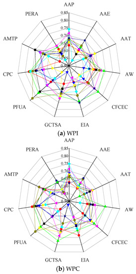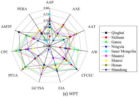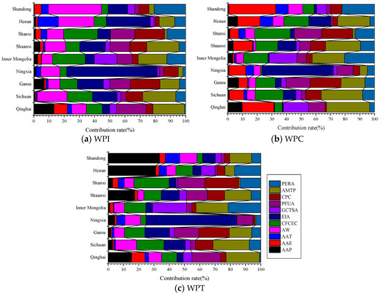 According to Figure 7a, the relative contribution rate of AMTP to WPI in Qinghai, Sichuan, and Shaanxi was the largest, being 20.86%, 21.69%, and 21.25%, respectively. The maximum relative contribution rate of CPC to WPI in Gansu was 19.50%, and the relative contribution rate of EIA to WPI in Ningxia and Henan was the largest, being 59.69% and 28.94%, respectively. The maximum relative contribution rates of CFCEC to WPI in Inner Mongolia and Shanxi were 21.55% and 22.43%, respectively, and the maximum relative contribution rate of AW to WPI in Shandong was 35.05%. According to Figure 7b, the relative contribution rate of AMTP to WPC in Qinghai, Sichuan, Inner Mongolia, Shaanxi, and Henan was the largest, being 29.25%, 28.19%, 22.01%, 23.79%, and 22.02%, respectively. The maximum relative contribution rate of CPC to WPC in Gansu was 21.17%, and the relative contribution rate of EIA to WPC in Ningxia was the largest, being 48.74%. The maximum relative contribution rate of CFCEC to WPC in Shanxi was 24.22%, and the relative maximum contribution rate of AAE to WPC in Shandong was 31.90%. According to Figure 7c, the relative contribution rates of AMTP to WPT in Qinghai and Sichuan was the largest, which were 21.91% and 23.74%, respectively. The maximum relative contribution rate of CPC to WPT in Gansu was 19.99%, and the relative contribution rate of GCTSA to WPT in Inner Mongolia was the largest, being 22.32%. The maximum relative contribution rate of EIA to WPT in Ningxia was 59.43%, and the maximum relative contribution rate of CFCEC to WPT in Shanxi was 22.98%. The relative contribution rate of AAP to WPT in Shaanxi, Shandong, and Henan was the largest: 17.35%, 31.13%, and 33.70%, respectively.