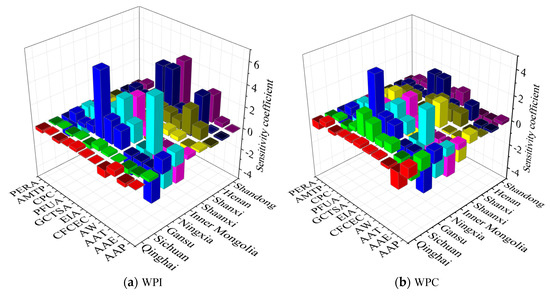 According to Figure 5b and Figure 6b, the grey correlation degrees were relatively larger between WPC and GCTSA (0.710), PFUA (0.727), and CFC (0.733) in Qinghai; between AAP and WPC (0.747) in Inner Mongolia; between CFC and WPC (0.719) in Shandong; between WPC and AAP (0.713), CFCEC (0.753), GCTSA (0.738), and AMTP (0.725) in Shaanxi; and between WPC and CFCEC (0.704), GCTSA (0.714), and PFUA (0.770) in Shanxi. The maximum sensitivity coefficients were relatively higher between AEE and WPC (−1.315) in Qinghai; between AW and WPC (−2.888) in Inner Mongolia; between EIA and WPC (−3.766) in Shaanxi; and between GCTSA and WPC in Shanxi (1.755) and Shandong (−1.552), indicating that WPC decreases with the increase in AEE, AW, EIA, and GCTSA. The grey correlation degrees were relatively larger between WPC and EIA (0.735) and CFC (0.756) in Sichuan; between WPC and AW (0.749), CFCEC (0.726), EIA (0.701), GCTSA (0.773), PFUA (0.759), and CFC (0.743) in Gansu; between CFC and WPC (0.707) in Ningxia; and between WPC and PFUA (0.806), CFC (0.743), and AMTP (0.726) in Henan. The maximum sensitivity coefficients were between AAT and WPC (2.710) in Ningxia, and between GCTSA and WPC in Sichuan (1.780), Gansu (4.330), and Henan (2.294), which indicates that WPC increased with the increase in AAT and GCTSA.