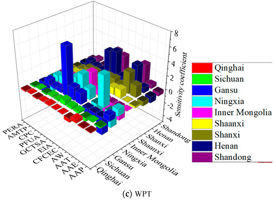 In Figure 5c and Figure 6c, the grey correlation between AMTP and WPT in Ningxia was relatively larger (0.703), and those of AAP, AAT, PFUA, CFC, and AMTP with WPT in Henan were 0.710, 0.730, 0.779, 0.725, and 0.703, respectively. The grey correlation of CFCEC and CFC with WPT in Sichuan was 0.725 and 0.767; that of AW, CFCEC, EIA, GCTSA, PFUA, CFC, and AMTP with WPT in Gansu was 0.725, 0.774, 0.700, 0.732, 0.749, 0.768, and 0.703, respectively; and that of CFCEC and EIA with WPT in Shandong was 0.779 and 0.708, respectively. The maximum sensitivity coefficients of AAT with WPT in Ningxia and Shanxi, EIA with WPT in Sichuan and Henan, and GCTSA with WPT in Gansu and Shandong were 4.472 and 3.015, 0.657 and 3.951, and 6.941 and 3.069, respectively, which indicates that WPT increased with the increase in AAT, AW, and GCTSA. The grey correlation degrees of PFUA, CFC, and AMTP with WPT in Qinghai were 0.753, 0.735, and 0.766, respectively; those of AAP, CFCEC, and CFC with WPT in Inner Mongolia were 0.752, 0.712, and 0.747; and those of AAP, AAT, and GCTSA with WPT in Shaanxi were relatively larger, being 0.718, 0.711, and 0.734, respectively. The maximum sensitivity coefficients of AW with WPT in Qinghai and Inner Mongolia were −0.516 and −3.692, respectively, and that of EIA with WPT in Shaanxi was −1.457, indicating that WPT decreased with the increase in AW and EIA.