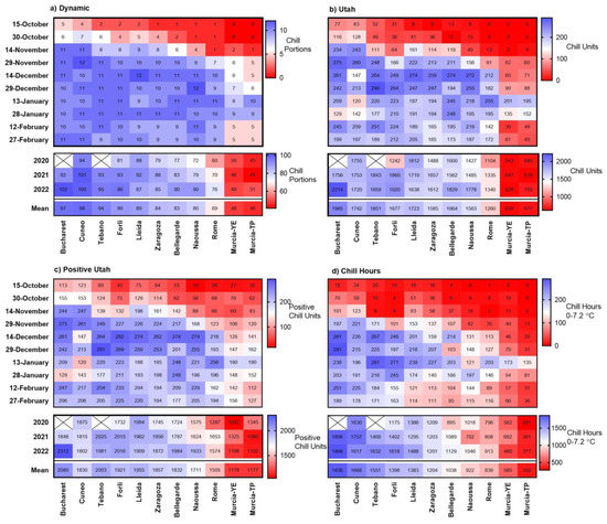 Heat-maps presenting the sum of chill accumulation during 15-d periods (from 1 October to 29 February) and yearly sums (2019–2022) and calculated with the (a) Dynamic (Chill Portions), (b) Utah (Chill Units), (c) Positive Utah (Positive Chill Units) and (d) Chill Hours models. X = no data. YE = Yéchar; TP = Torre Pacheco.