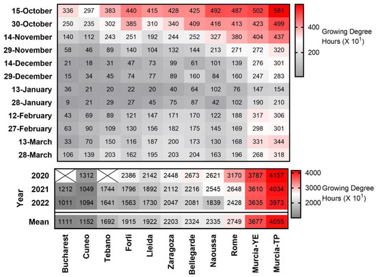 Heat-map presenting heat accumulation (in growing degree hours (GDH) (X101)) accumulated during 15-day periods from 1 October until 29 March in 11 European sites in the 2019–2022 three-year period. The sum of GDH during February–March is also presented for each studied period and year. X = no data. YE = Yéchar; TP = Torre Pacheco.