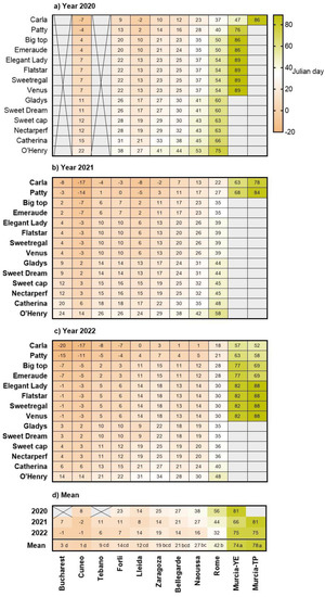 Heat-map showing Julian days of dormancy release, estimated as the day that chill was satisfied, for 14 peach and nectarine cultivars grown in 11 European sites, during (a) 2020, (b) 2021, (c) 2022, and (d) mean values. X = no data. Empty cells indicate that dormancy release was not achieved. YE = Yéchar; TP = Torre Pacheco. Negative values indicate days in the previous year. Means with different letters indicate significant differences among sites and cultivars, using the Tukey multiple range test.