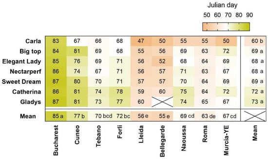 Heat-map showing Julian days of beginning of bloom in 7 cultivars located in 9 sites. Mean values for 2021 and 2022 are shown. X = no data. YE = Yéchar. Means with different letters indicate significant differences among sites and cultivars, using the Tukey multiple range test.