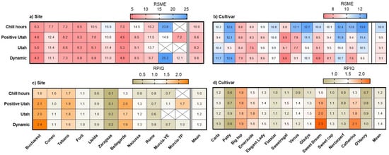 (a,b) Root mean square error (RMSE), and (c,d) ratio of performance to interquartile distance (RPIQ), for the observed versus estimated full bloom dates for (b,d) 14 peach and nectarine cultivars, and (a,c) at 11 European sites, calculated using four models. Sites are presented from those having the highest to the lowest chill accumulation, and cultivars from having the lowest to the highest chill requirements. Chill requirements are estimated using the Dynamic Model.