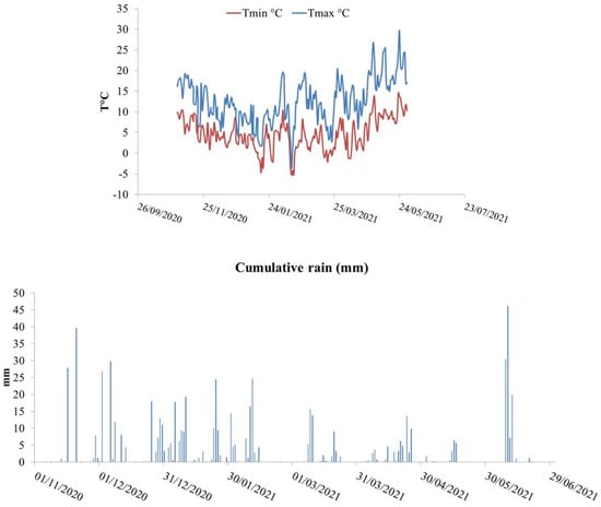 Meteorological data: daily minimum (Tmin °C) and maximum (Tmax °C) (top) and cumulative rain during the growth season 2020–2021 (bottom).