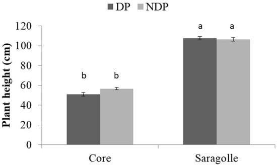 There was a significant difference in phenology between cultivars: Saragolle was almost 2 weeks behind Core, and clipping delayed phenology in both cultivars. During the first week of May (4 May), the Core variety had reached the heading stage with advanced phenology in unclipped plots (150 vs 248 emerged spikes m−2 for clipped vs unclipped plants, respectively) (p-value < 0.05), while Saragolle was still in the booting stage, and no spikes had emerged in both clipped and unclipped plots. By 13 May, the Core variety had reached anthesis, showing a small, non-significant difference in spike density between treatments (450 and 500 spikes m−2 in clipped and unclipped plots, respectively). By that date, the Saragolle variety was still behind (heading stage) but similarly delayed by clipping, with 93 vs 185 emerged spikes m−2 in clipped vs unclipped plots, respectively, p-value < 0.05). By 20 Ma, the Saragolle variety had reached the flowering stage, while grain filling had begun for Core. Plant height (measured from the base of the stem to the last node) of the Saragolle variety was twice that of the Core variety (Figure 2) but was not affected by clipping.