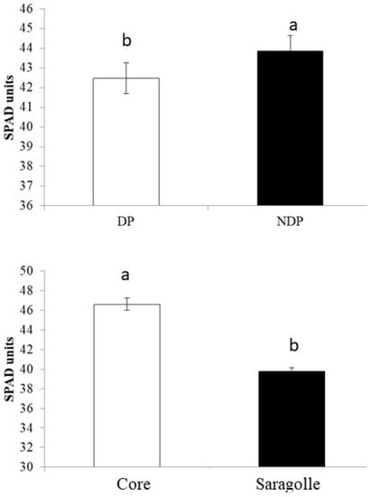 The final number of spikes m−2 was significantly lower in Saragolle (266 spikes m−2) than in Core (p-value = 0.0018). The higher number of spikes m−2 for Core is attributable to the higher ratio of fertile to unfertile culms (90%) compared to Saragolle (70%). SPAD was measured on three dates (4, 13, and 20 May), SPAD did not vary significantly between dates but was consistently higher in Core (p-value < 0.001) (Figure 3 bottom). There was also a minor but significant effect of clipping that reduced leaf chlorophyll content slightly (−3% in clipped plots (p-value < 0.05). Average values are reported in Figure 3 (top).