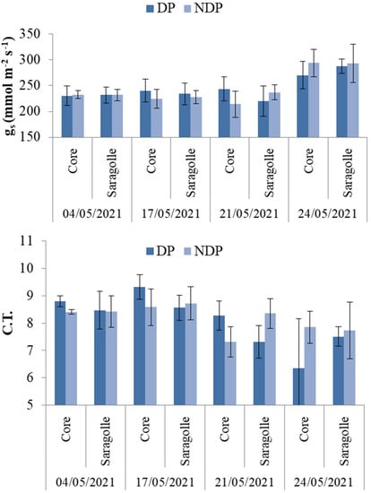 Bar plots of the mean values overlaid by standard deviation bars of stomatal conductance (gs) (mmol m−2 s−1) (top) and the ratio between gs and temperature (C.T.) (bottom) at different dates during the reproductive stage in clipped (DP) (dark blue columns) and unclipped (NDP) (light blue columns) treatments in Core and Saragolle varieties.