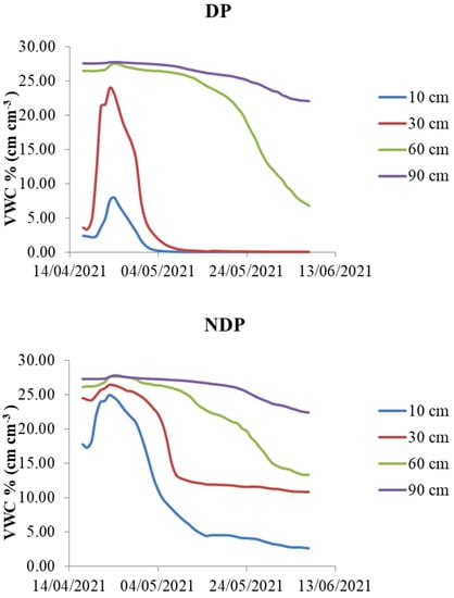 Volumetric water content % (VWC cm cm−3) during the reproductive stage under dual-purpose (DP) and conventional (NDP) management at the four soil depths where the probes were installed (10 cm, 30 cm, 60 cm, 90 cm).