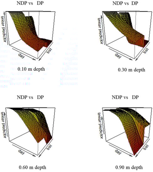 Gam model trend surface at the four soil depths: 0.10 m; 0.30 m top left and right; 0.60 m and 0.90 m bottom left and right. The three-dimensional graphs show the model predicted values of volumetric water content: y-axis «linear predictor»), for the two clipping regimes: z-axis «trat» for unclipped (NDP) (foreground) and dual purpose (DP) (background) during the reproductive stage (x-axis «day»). Records from 17 April–7 June 2021).