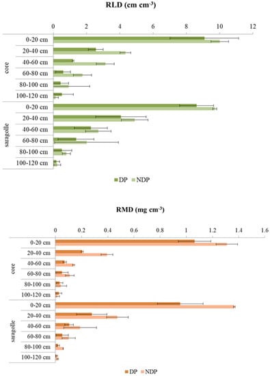 Root length density (RLD) (top) and root mass density (RMD) (bottom) in Core and Saragolle varieties under dual-purpose (DP) and conventional management (NDP) of six soil layers from surface soil to 1.20 m. Means are overlaid by standard deviation bars.