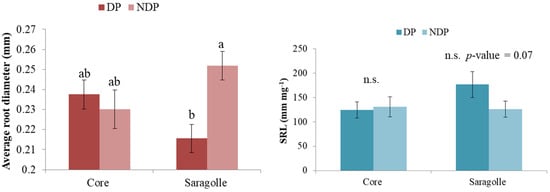 Left: interaction of wheat variety and clipping management on root average diameter, bar plots of the means overlaid by standard error bars; different lowercase letters over the bars depict significant differences between means (p-value < 0.05). Right: interaction of wheat variety and clipping management on specific root length (SRL), bar plots of the means overlaid by standard errors bars with indication of significance (n.s.= non significant).