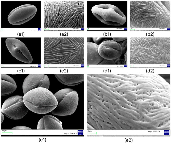 SEM analysis of Nitraria pollen grains: N. sibirica (a1,a2); N. komarovii (b1,b2); N. shoberi (c1,c2); N. pamirica (d1,d2); N. iliensis (e1,e2); 1—equatorial view, 2—details of the exine surface.