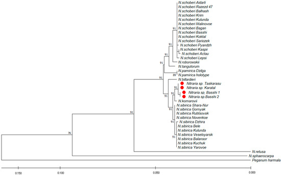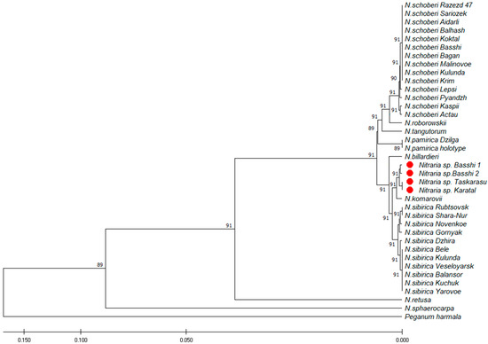 The sequences were viewed using Data Collection v. 3.1 and were read using Sequencing Analysis Software v.6. The sequences were pairwise-aligned using the BioEdit v.7.1.9 program [64], multiple alignment was performed using the ClustalW2 program, followed by verification of ambiguous positions in the chromatograms and manual editing. Aligned sequences were analyzed using the MEGA X program [65]. The phylogenetic tree was constructed using the UPGMA method and the maximum likelihood method based on the Tamura–Ney model [66]. To construct the phylogenetic tree, we employed fragments deposited in GenBankNCBI (N. sphaerocarpa: DQ267177; KP087761; N. retusa: KP087772; KP087764; N. roborowskii: DQ309042; KP087762; N. tangutorum: DQ267176, KP087763; N. billardieri: KP087775; KP087767; N. komarovii: KP087774; KP087766). Peganum harmala L. (KP087776; KP087768) was used as the outgroup closely related to the genus Nitraria.