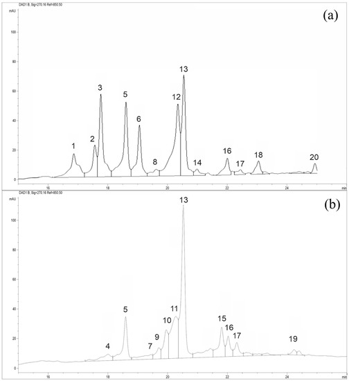 HPLC-MS chromatograms of 70% water–ethanol extracts Nitraria leaves: (a) N. sibirica, (b) N. iliensis. The abscissa is the retention time, t, min; ordinate—optical density, e.o.p., mAU; 1—rutin; 6—quercitin; 13—hyperoside; 18—baicalin; 20—dihydroxymethoxyflavone; 2–5, 7–12, 14–17, 19—unidentified compounds.