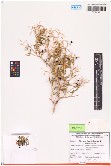 - Kovtonyuk, N.K.; Tomoshevich, M.A.; Banaev, E.V. Typification of the name Nitraria komarovii (Nitrariaceae). Bot. Pac. 2019, 8, 115–118. [Google Scholar] [CrossRef]