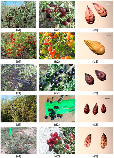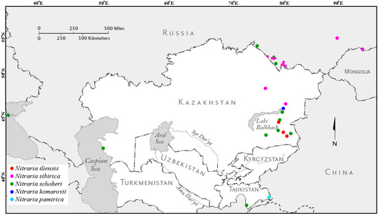 For the studied region (Siberia, Crimea, Kazakhstan, and Tajikistan), only three Nitraria species (N. schoberi, N. sibirica, N. pamirica) are indicated in the literature [24,25,26,27,28,29,30]. Recently, another species, N. komarovii, has been recorded in the territory of Kazakhstan in the Balkhash-Alakol basin [31].