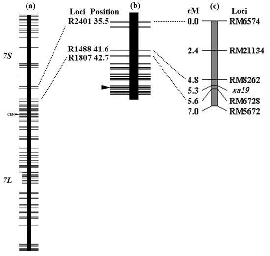 Linkage map of xa19 and surrounding DNA markers. (a,b) RFLP framework maps of chromosome 7 modified from Harushima et al. [47]. (c) the linkage map of xa19 gene constructed from F2 population from the cross between XM5 and IAS44 (n = 210). DNA markers located near each other on Os-Nipponbare-Reference-IRGSP-1.0 are connected by dotted lines.