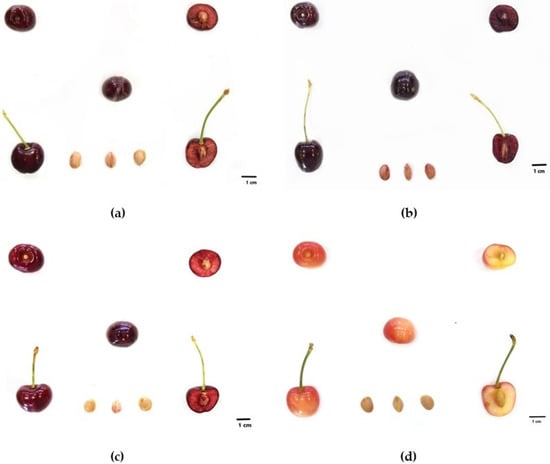 The results of morpho-physiological and physicochemical trait characterization are reported in Table 1. Cherry varieties’ fruit weight is influenced by crop load and fruit maturity stage [20,21].